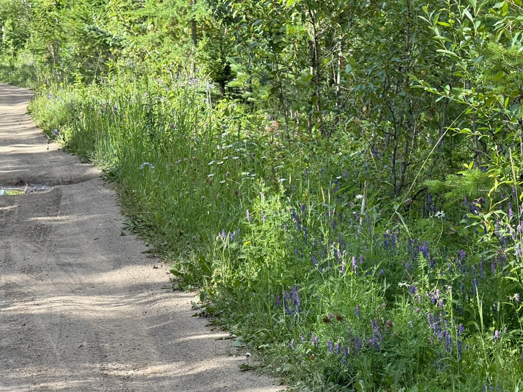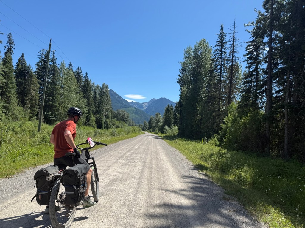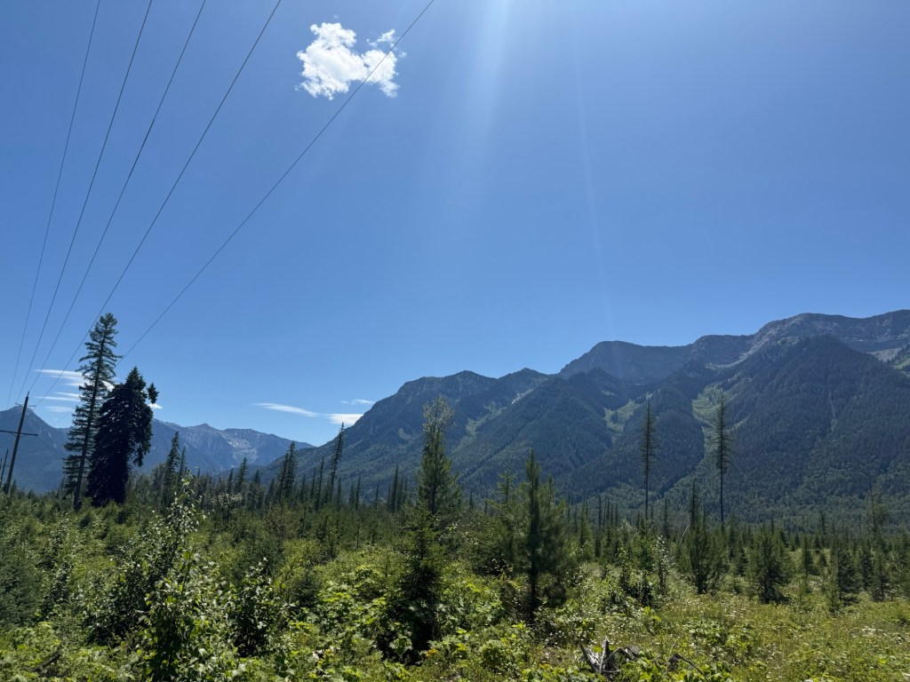 We then rode the dirt road down the Elk Valley which we followed for two days almost to the U.S. border. On the way we passed through Elko, Sparwood and Fernie. Elko and Sparwood are fairly prosperous mining towns and Fernie has become a ski and mountain biking town. One of the best things about the area is that there are dozens of mountain bike trails connecting the towns. It makes for really fun riding. With trails and roads through meadows bordered with wildflowers.